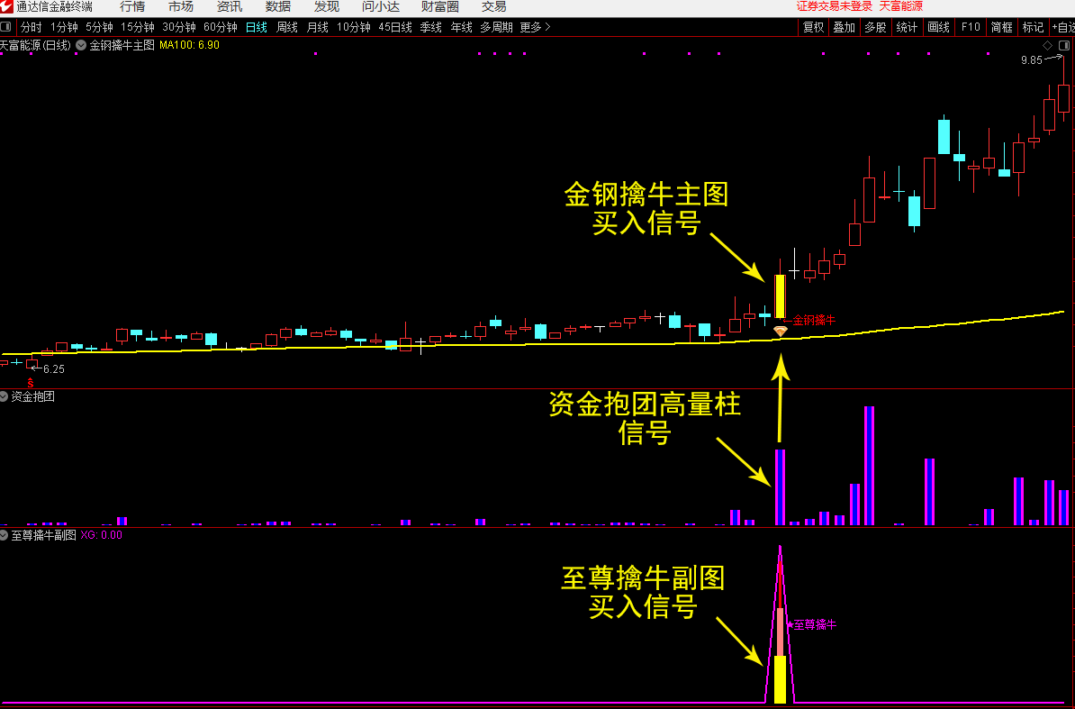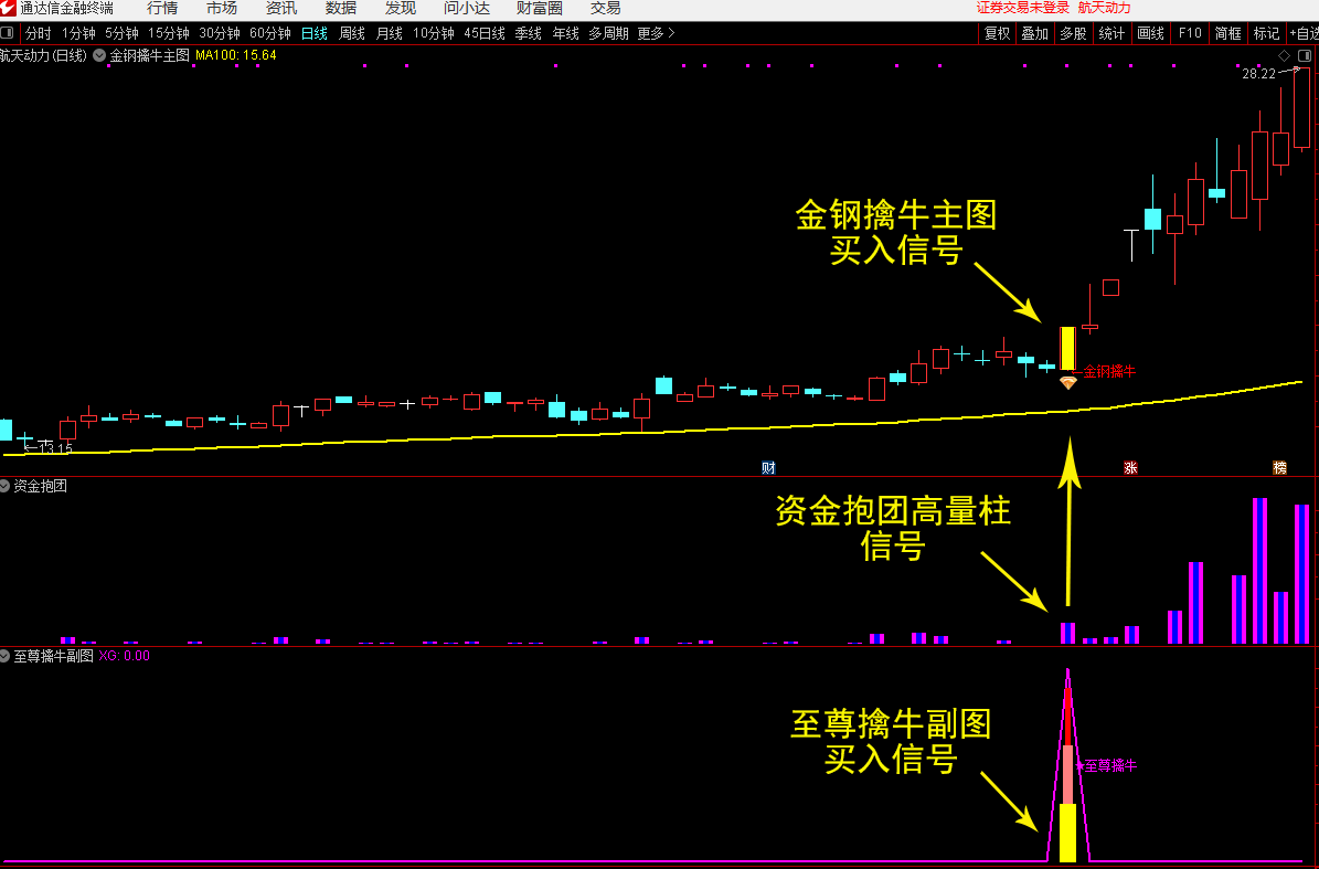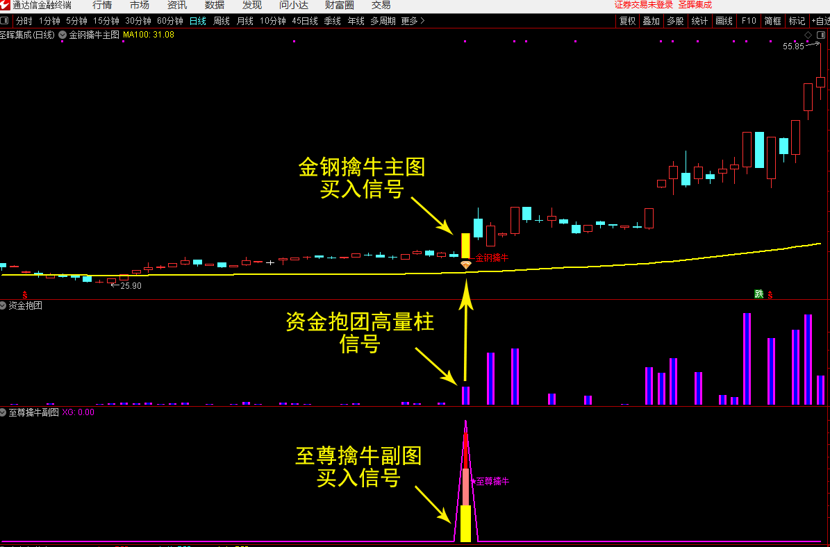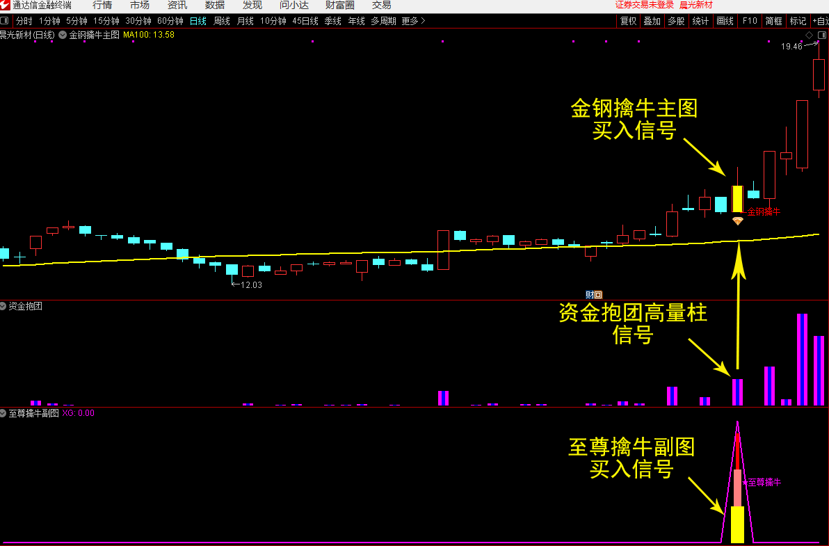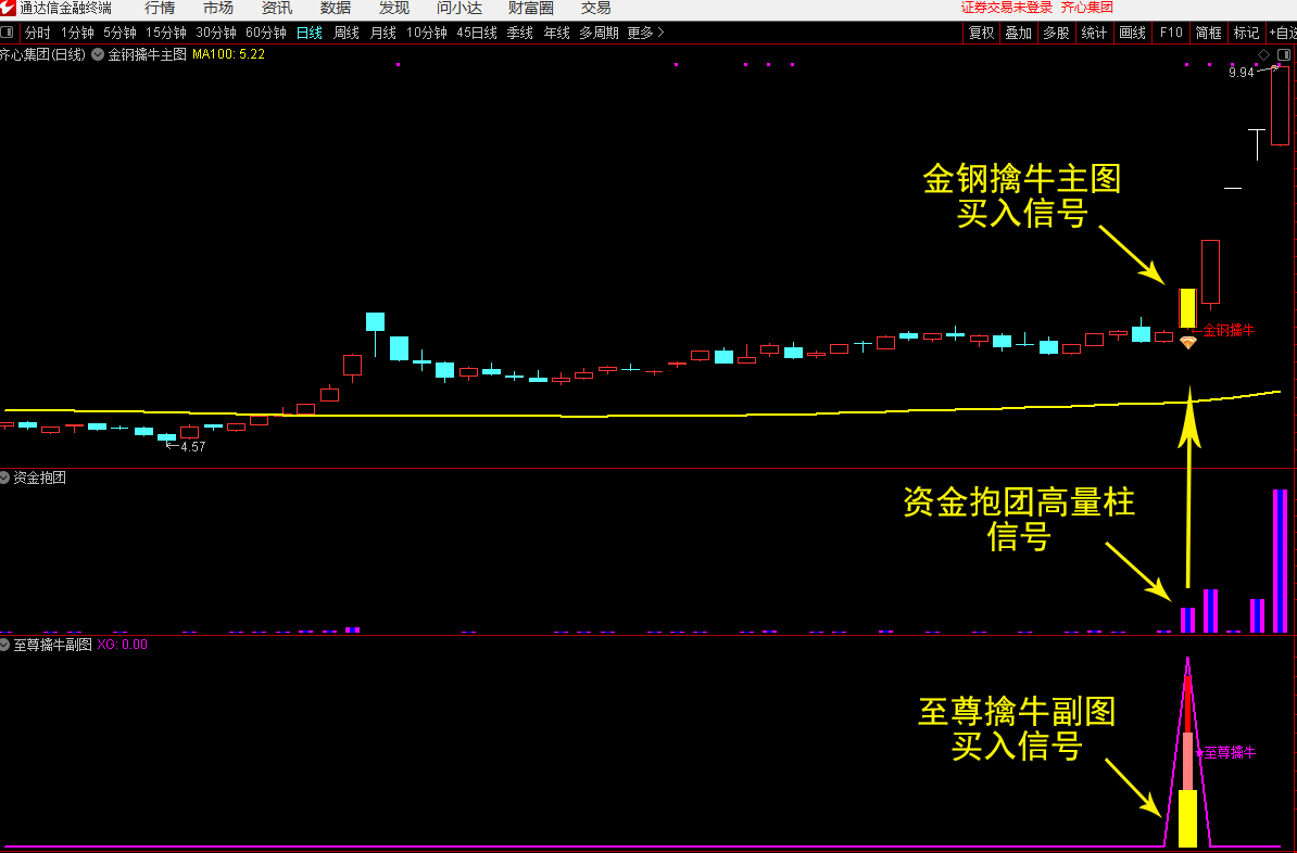 (3)当【至尊擒牛】副图指标与【资金抱团】副图指标同时出现时为买入信号,跌破信号K线最低点要果断离场。
