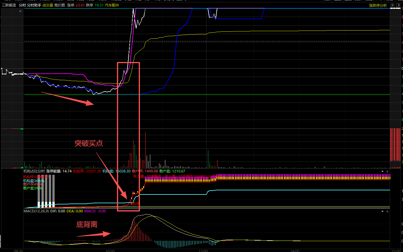 均价线突破:实时价格线放量突破均价线且站稳,特别是开盘冲高回落后形成二次突破,为强势买入信号。