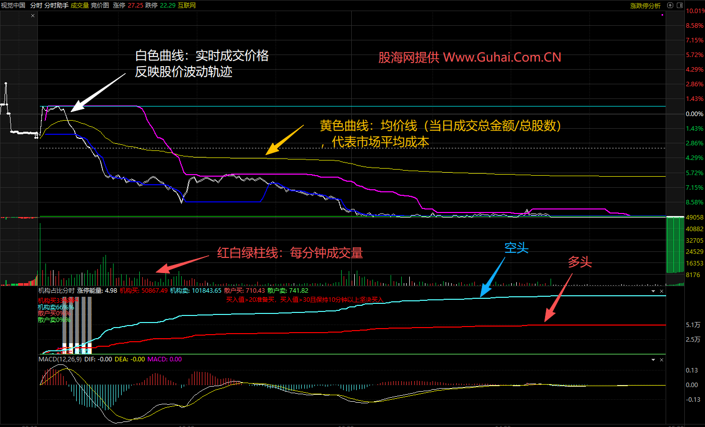 黄色曲线:均价线(当日成交总金额/总股数),代表市场平均成本。