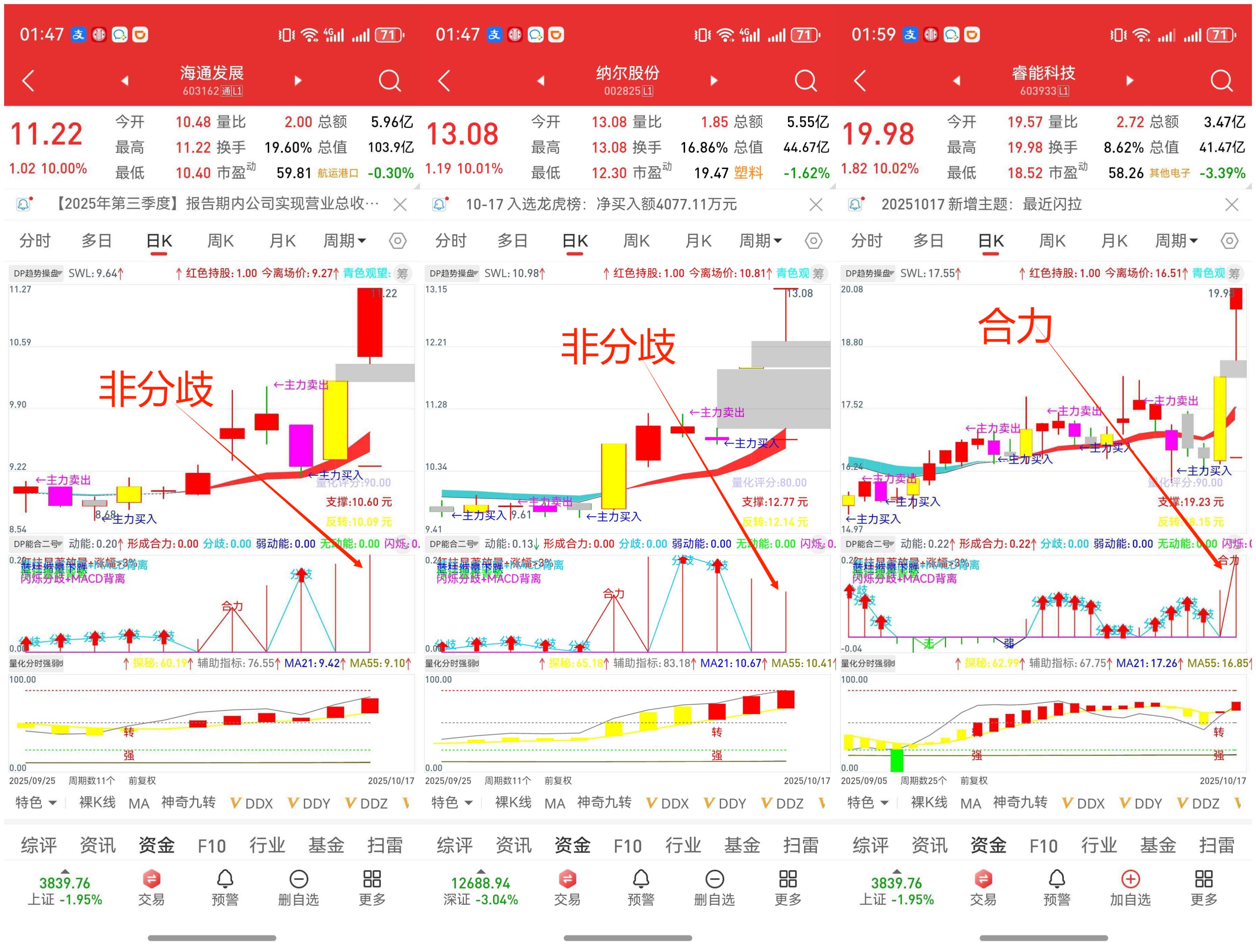 (4)点开日K图,“DP能合二号”指标为“红线合力”或“红线”均可大胆买入(分歧不操作,防止冲高回落),这就是所谓的“三分操作”。
