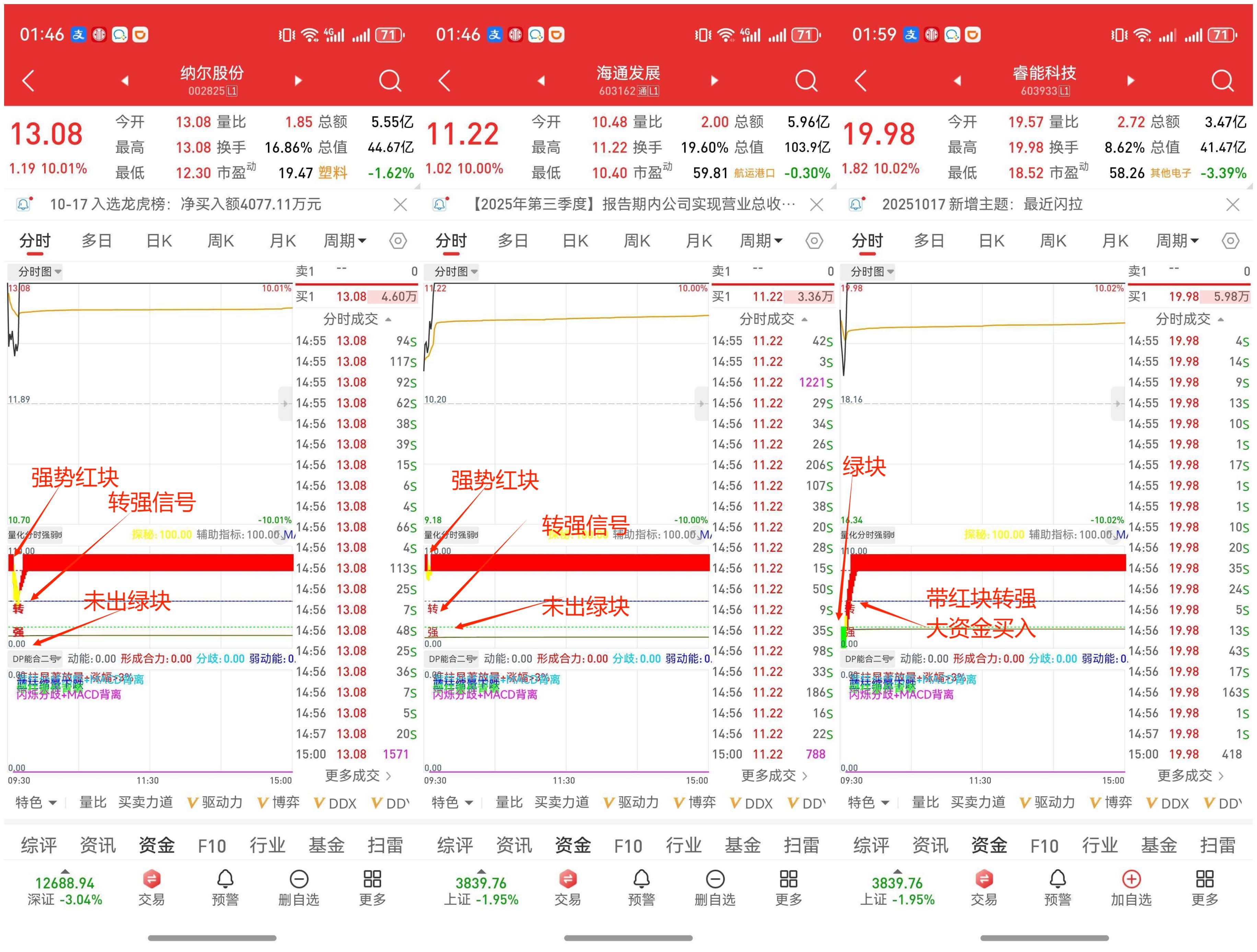 (3)确认买入条件:快速点开目标的分时图,分时上的“量化分时强弱J”图的上方是强势“红块”的,或者下方是“绿块带红线转强”的,是二次标的(不符合提交不考虑);